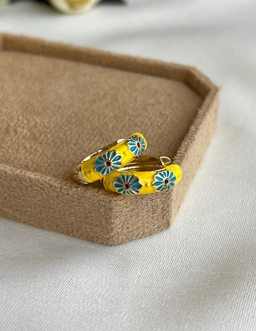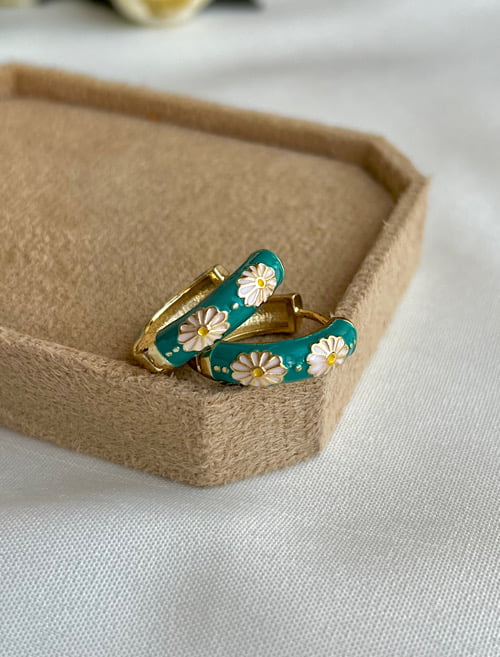 گوشواره حلقه ای میناکاری رنگ آبی با گل سبز دورتادورش میناکاری شده روی گوش بی نظیر دیده میشه