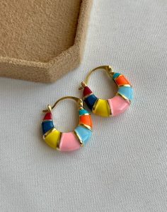 گوشواره حلقه ای میناکاری رنگ نارنجی دورتادورش میناکاری شده روی گوش بی نظیر دیده میشه