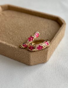 گوشواره حلقه ای میناکاری رنگ بنفش با گل سرخابی دورتادورش میناکاری شده روی گوش بی نظیر دیده میشه