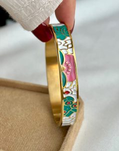استیل رنگ ثابت مناسب دور مچ ۱۵تا ۱۸سانت رنگ طلاییدستبند میناکاری مدرن پهن ۰۲۳