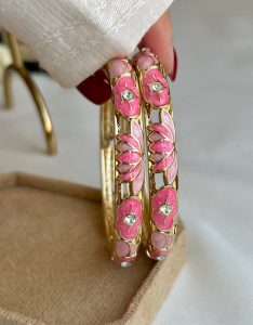 با مروارید صنعتی مناسب دور مچ ۱۵ تا ۱۸ سانت با قفل آسانسوریدستبند میناکاری طلایی گلبهی