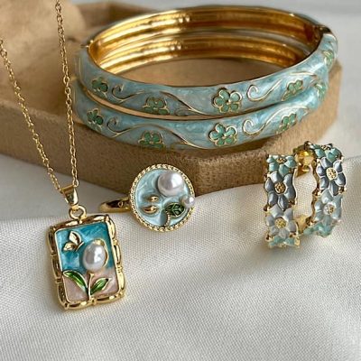 ست شامل یک دستبند ٫گردنبند ٫ انگشتر و‌ یک جفت گوشواره هست